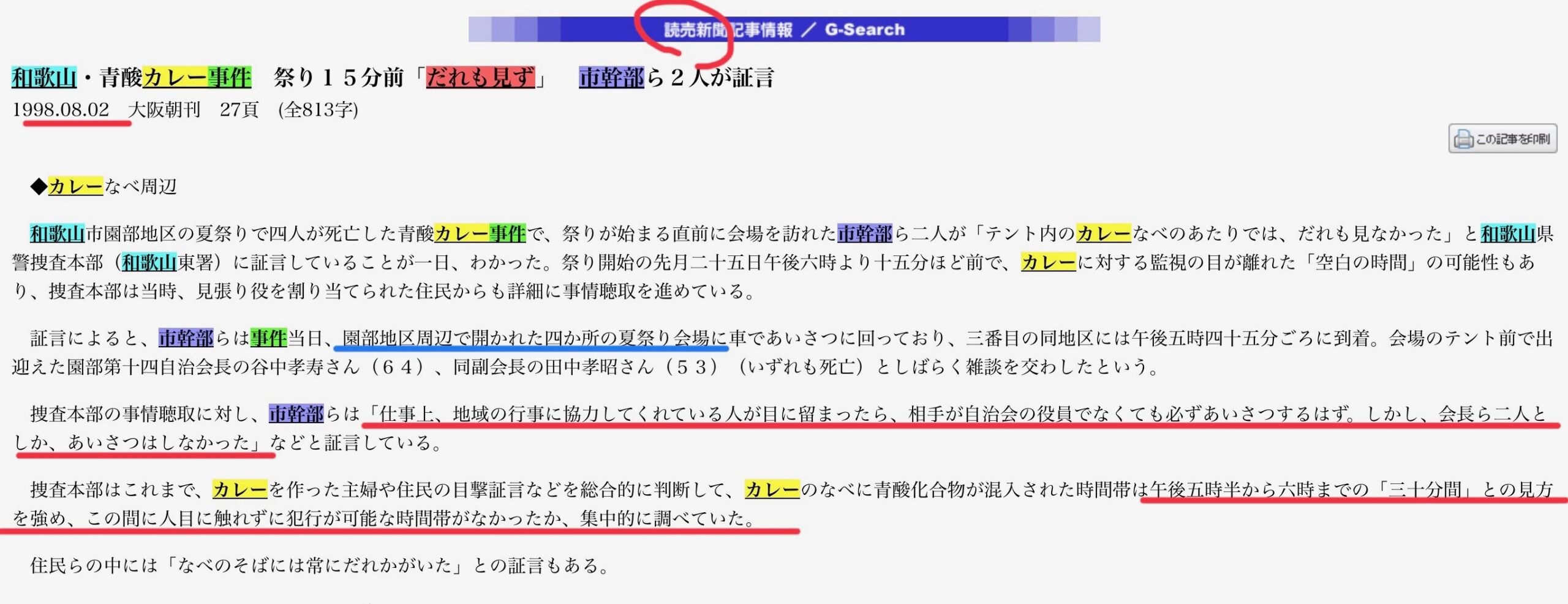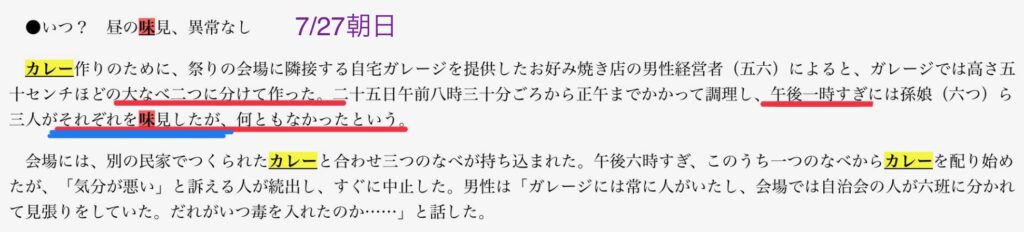 検察側の隠蔽の意図はあり得るな。というのも、産経記事に「別の一人は夏祭り会場の空き地で(略)午後五時過ぎに口にしていた」とあるが、これは判決文に書いてあるんや。