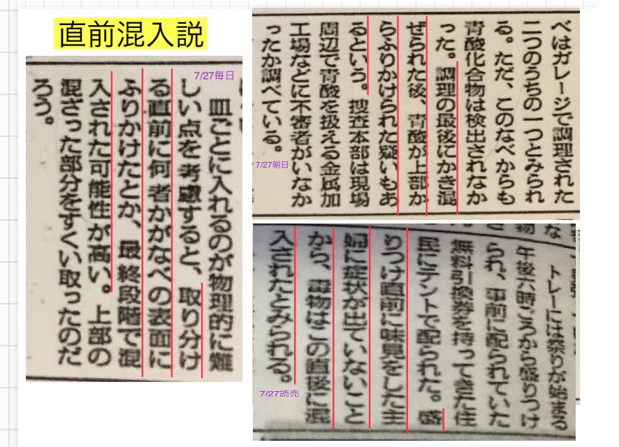 そもそも事件直後の新聞はみんな「直前」の混入と書いていたんやで。その見方はヒ素でもシアンでも変わらんはずや。