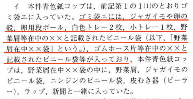 - ヒ素混入に使われた紙コップが入っていたゴミ袋は、主婦がガレージから会場に移したときに口をしばって、それ以降はゴミを入れることができなかったのだから、紙コップがゴミ袋に入れられたのはガレージである