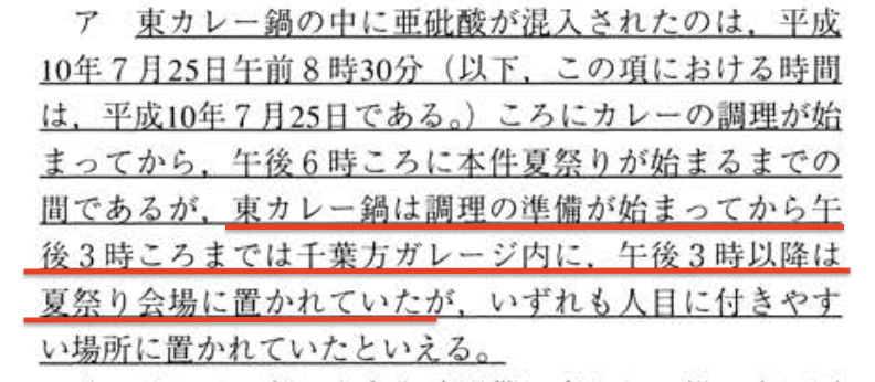 でもカレーマンは、カレー鍋が夏祭り会場に運ばれてからお祭りが始まるまでの❹の時間にも混入する機会は少しはあったと裁判所は判断した、とみている。