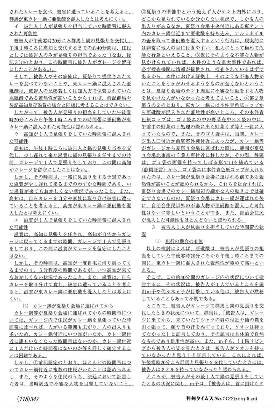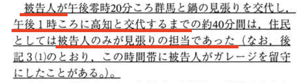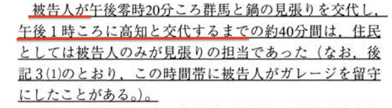 とまれ判決文では、上記4つの時間帯に加えて、林眞須美先生の前後に一人で見張りをした3人の主婦についても検討していて、そこも含めてすべて、混入機会はなかったと結論しているんや。