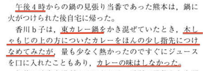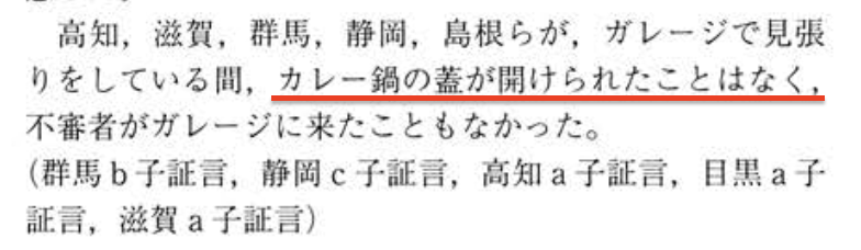 13:00以降の見張りのときに「カレー鍋の蓋が開けられたことはなく」? なに言ってるの?? テレビは「1時から2時半」、朝日は「一時すぎ」、産経は「正午過ぎ」に味見をしたと報じているじゃない。