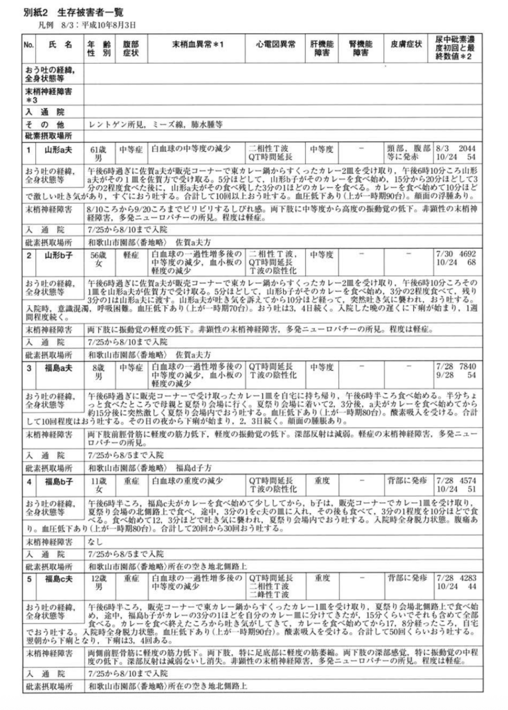 そうや。確定一審判決文の資料に、生存者63人の症状がこんなふうに掲載されててな。