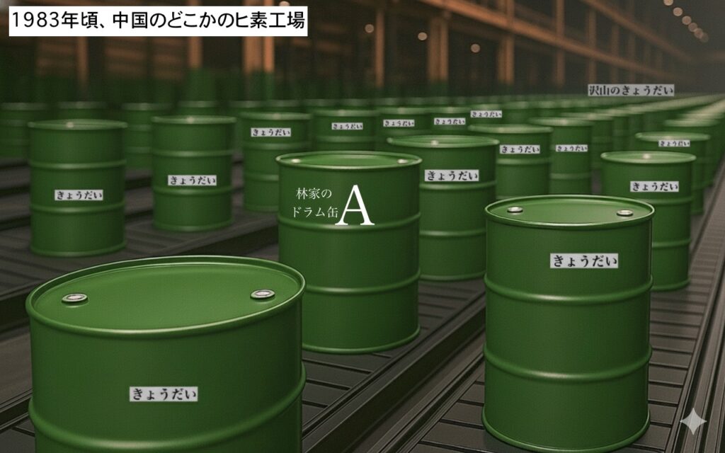 中国の工場で作られる50kgヒ素入りのドラム缶たち(イメージ)。Aの周辺の「きょうだい」」のヒ素はすべて「同じ組成」とみていいだろう。実は希少でもなんでもないことが分かる。
