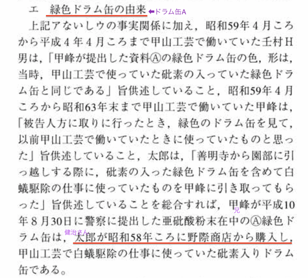 林家のヒ素のルーツとなるドラム缶Aやけど、判決文に登場するのは、健治さんが1983(昭和58)年に購入して以降なんや。赤下線だけ読めばええで。