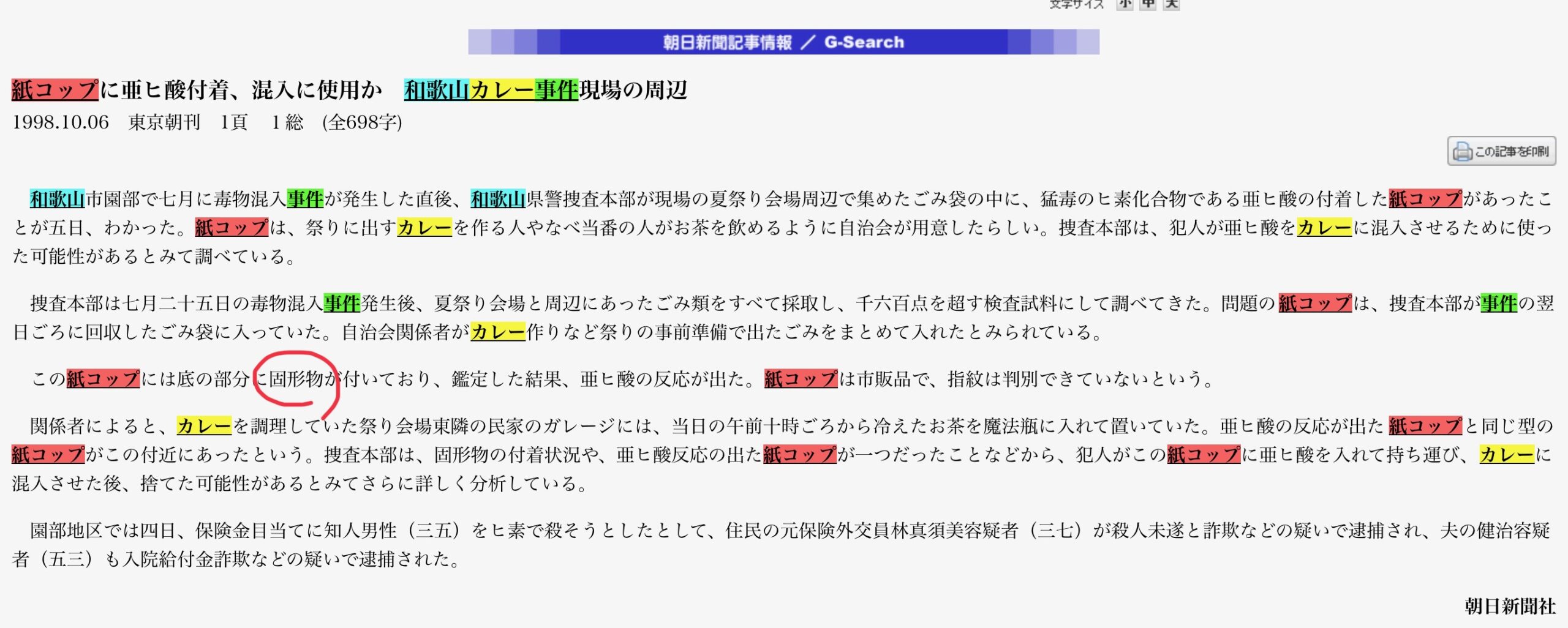 あるで。毎日新聞の10/6夕刊のあと追い記事や。この紙コップを使ってカレー鍋にヒ素を混入したという捜査本部の見方を伝えたあと、末尾に地の文でこんなことを書いているで。