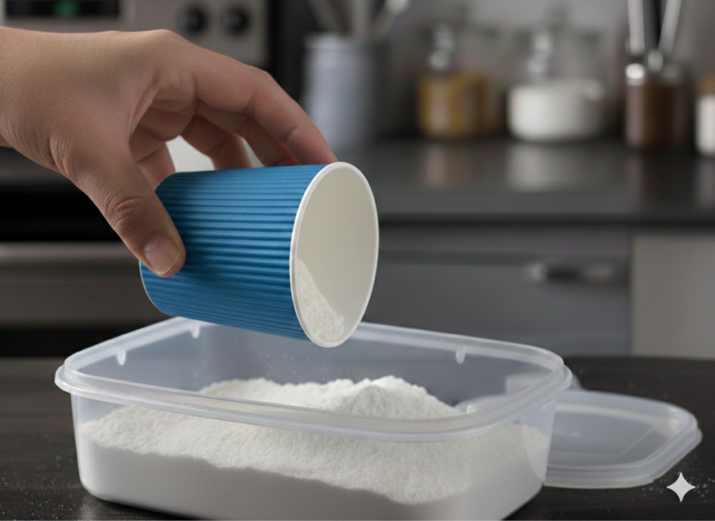 樹脂製の容器は流し台下の収納庫にあった。ふたのない状態で、中には封を切っていない買い置きの調味料などが入っていた。