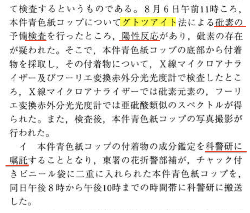 プラ容器も青色紙コップも、科捜研に搬送されて、グトツアイト法という簡易な検査をしたところ、ヒ素の陽性反応があった。