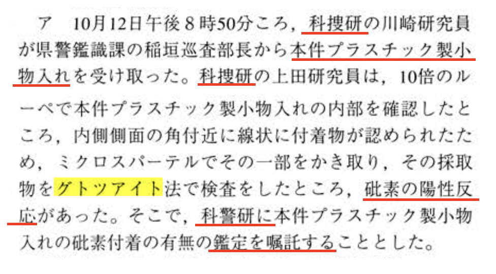 11月5日に、林家関連のどのヒ素を科警研の異同識別鑑定に依頼するかが決まったんだけど、そこにプラ容器は入れてもらえなかったのよ、微量すぎて。