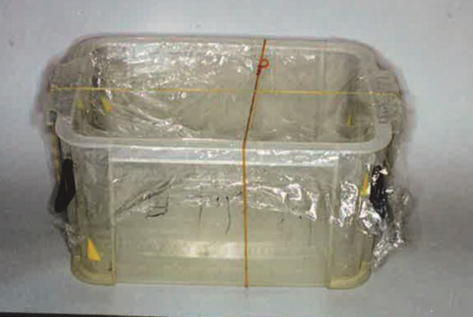 樹脂製の容器は流し台下の収納庫にあった。ふたのない状態で、中には封を切っていない買い置きの調味料などが入っていた。