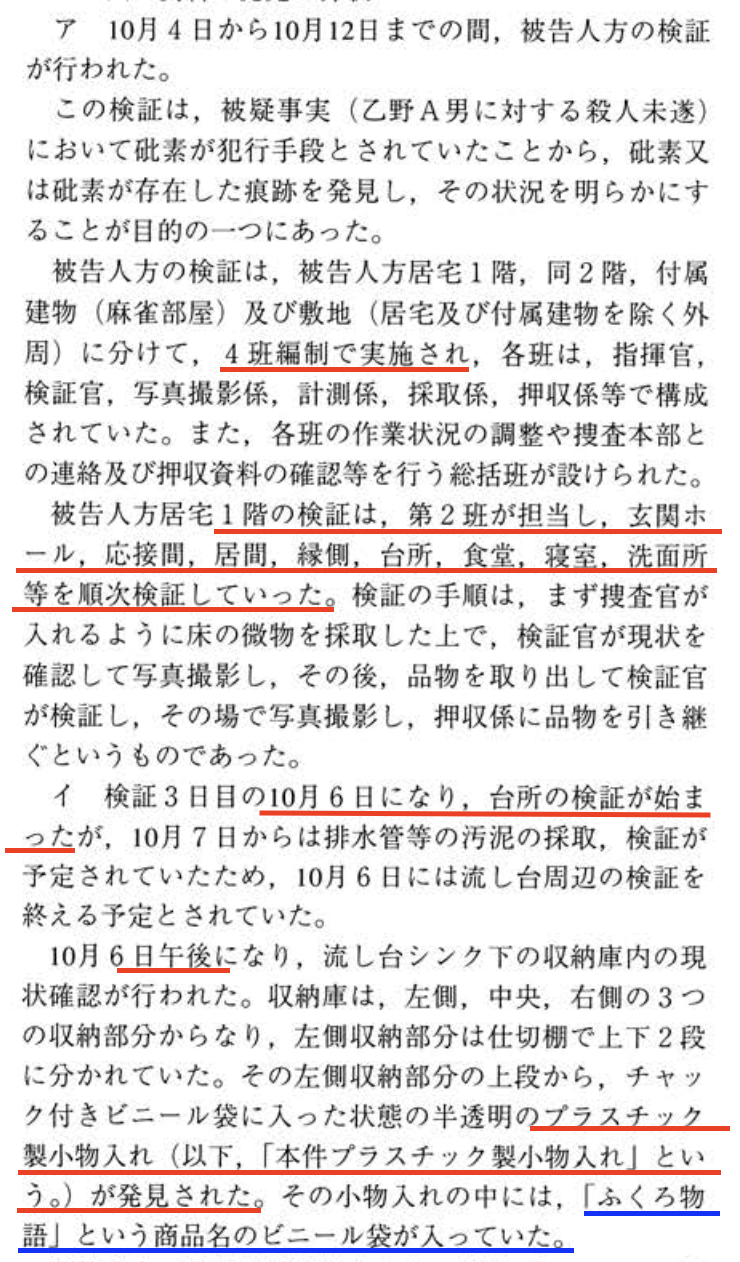 ふつうに考えて、食品関係の事件やから台所は最初に捜索するやろしな。書籍の記述との矛盾を裁判所がどう判断するかや。
