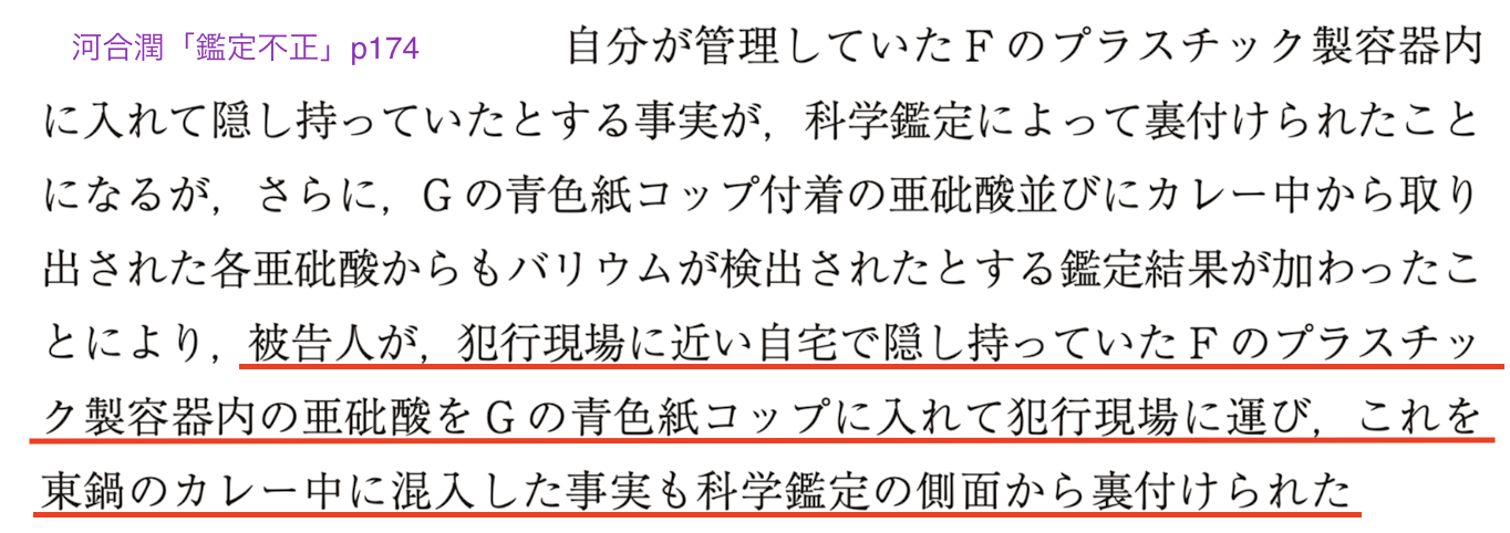 ていうか、だから確定一審判決は「プラ容器→青色紙コップ→カレー鍋」のルートは無理だと判断して、「いずれかの亜ヒ酸→青色紙コップ→カレー鍋」と書いたわけでしょう?