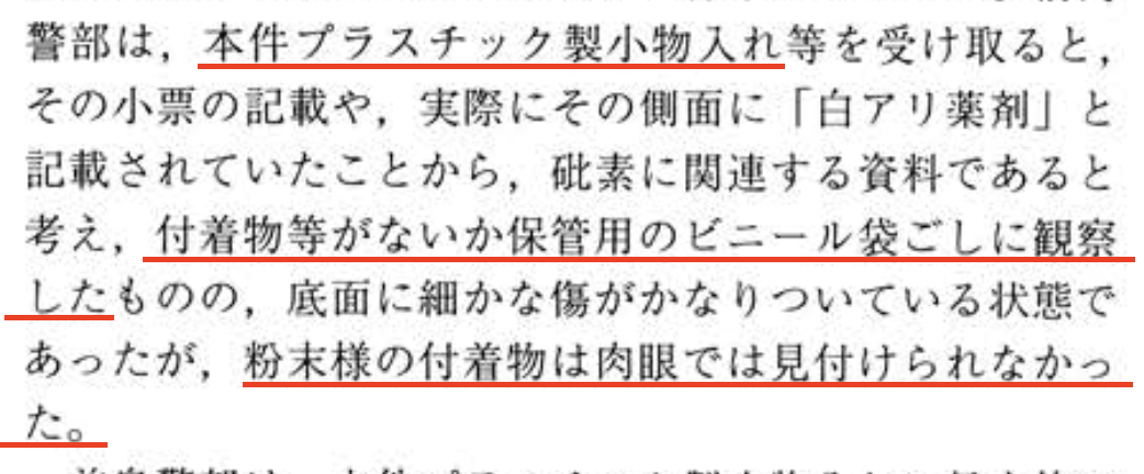 もともとヒ素が入っていて所持しているとヤバイと認識していた、側面に「白アリ薬剤」とモロにヤバイ文字が書いてある、屋外で使用されていて台所のシンク下に置くには不衛生なプラ容器を、微量のヒ素と判別不能な指紋が残るぐらいに中途半端に洗浄して、チャック付きビニール袋に入れて他の入れ物に紛らわせて目立たないように保管していた。