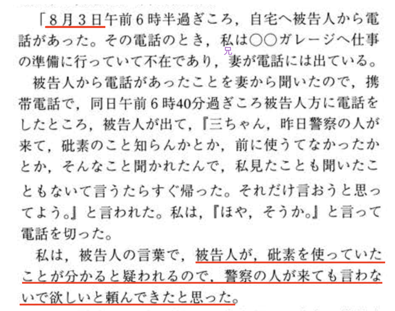 8月2日夜にヒ素検出のニュースが流れた翌朝すでに、自分とヒ素は関係ないと警察には答えてくれとお兄さんに伝えたぐらいやからな。