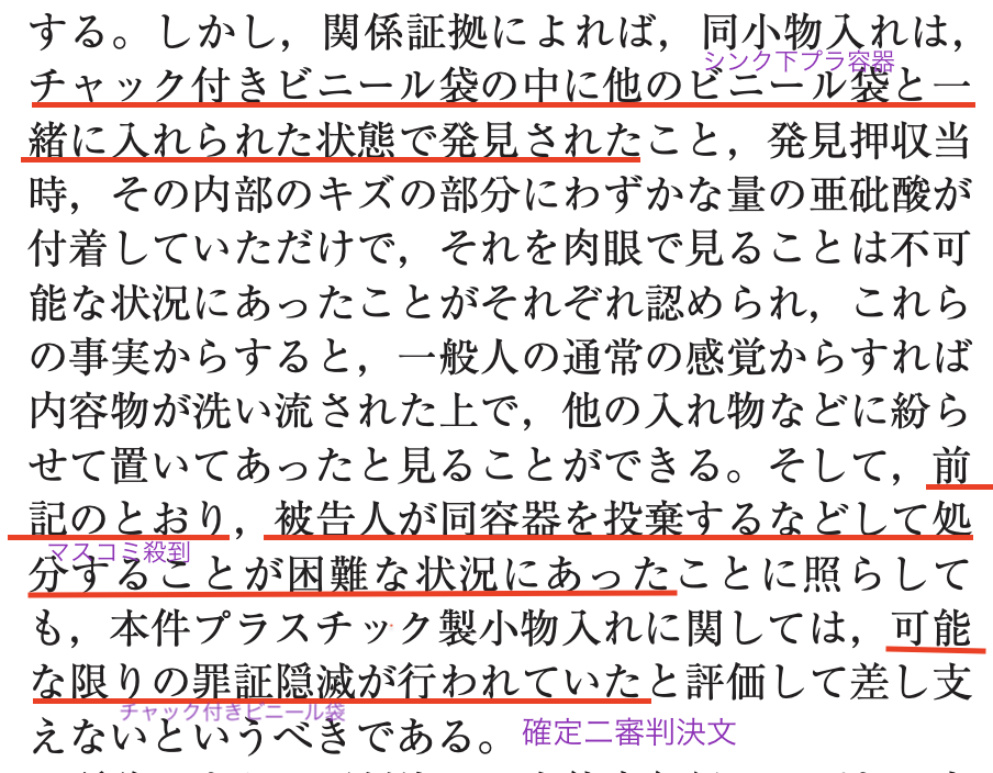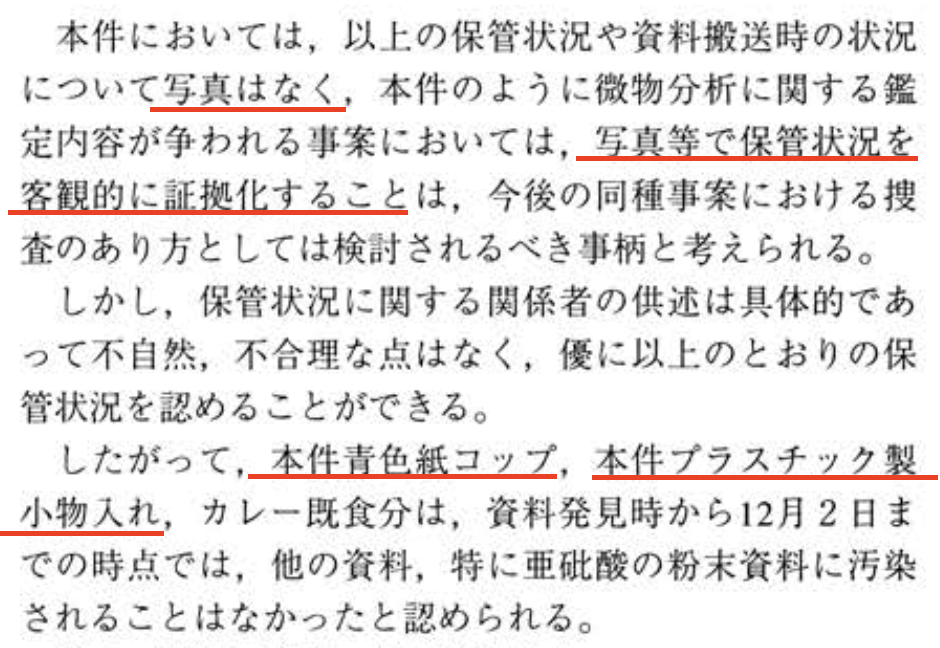 さらに意味不明なのが確定二審の判決や。まさに弁護団が、プラ容器を捨てなかったのはおかしいと主張したのに対し、マスコミが殺到していてプラ容器を投棄するのも困難だったと認定しているんや。