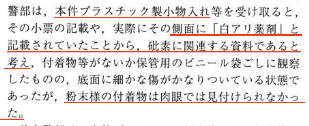 それに、記事には「隅の部分に白い粉状のものがわずかに付着していたため」と書いてあるわ。判決文には「粉末様の付着物は肉眼では見付けられなかった」と書いてあるのに。