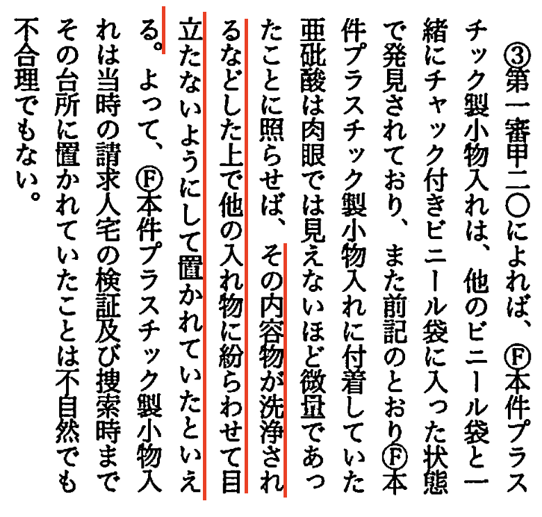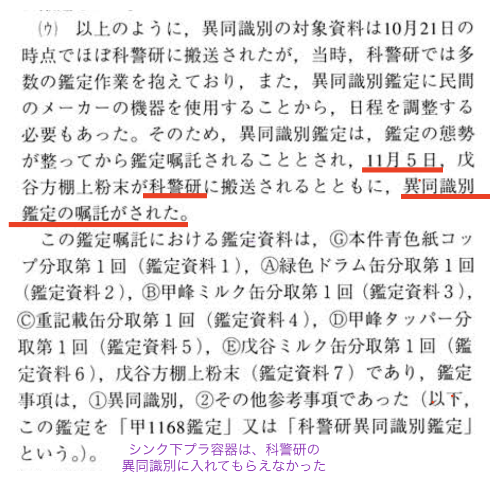 それに、驚くのは浅見決定のここなんだけど、プラ容器が「他のビニール袋と一緒にチャック付きビニール袋に入った状態」だったということは「他の入れ物に紛らわせて目立たないようにして置かれていた」のだから、台所シンク下にあっても「不自然でも不合理でもない」ですって??