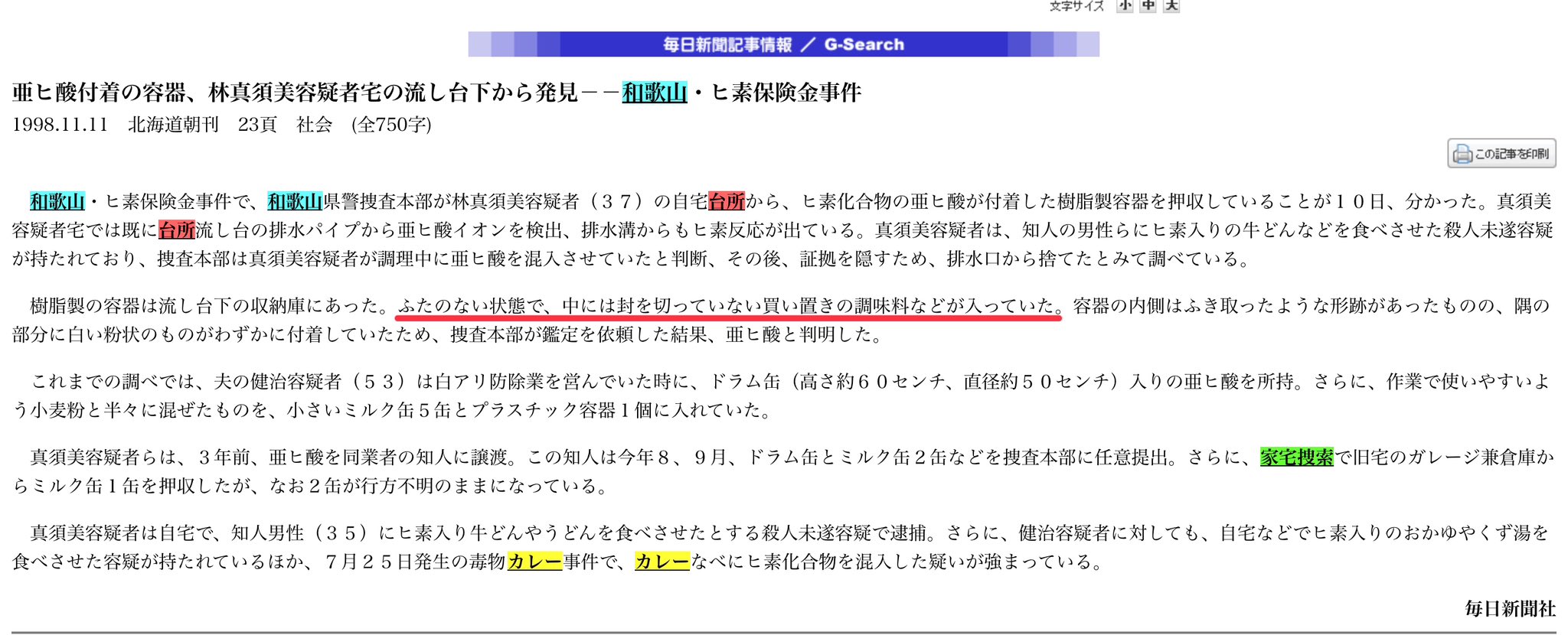 ほんとだわ。判決文によると10月6日にプラ容器を「発見」し、10月12日に容器からヒ素を「検出」したけど、新聞に公表されたのはその1ヶ月後だったのね。他紙はどのぐらい追いかけたのかしら?
